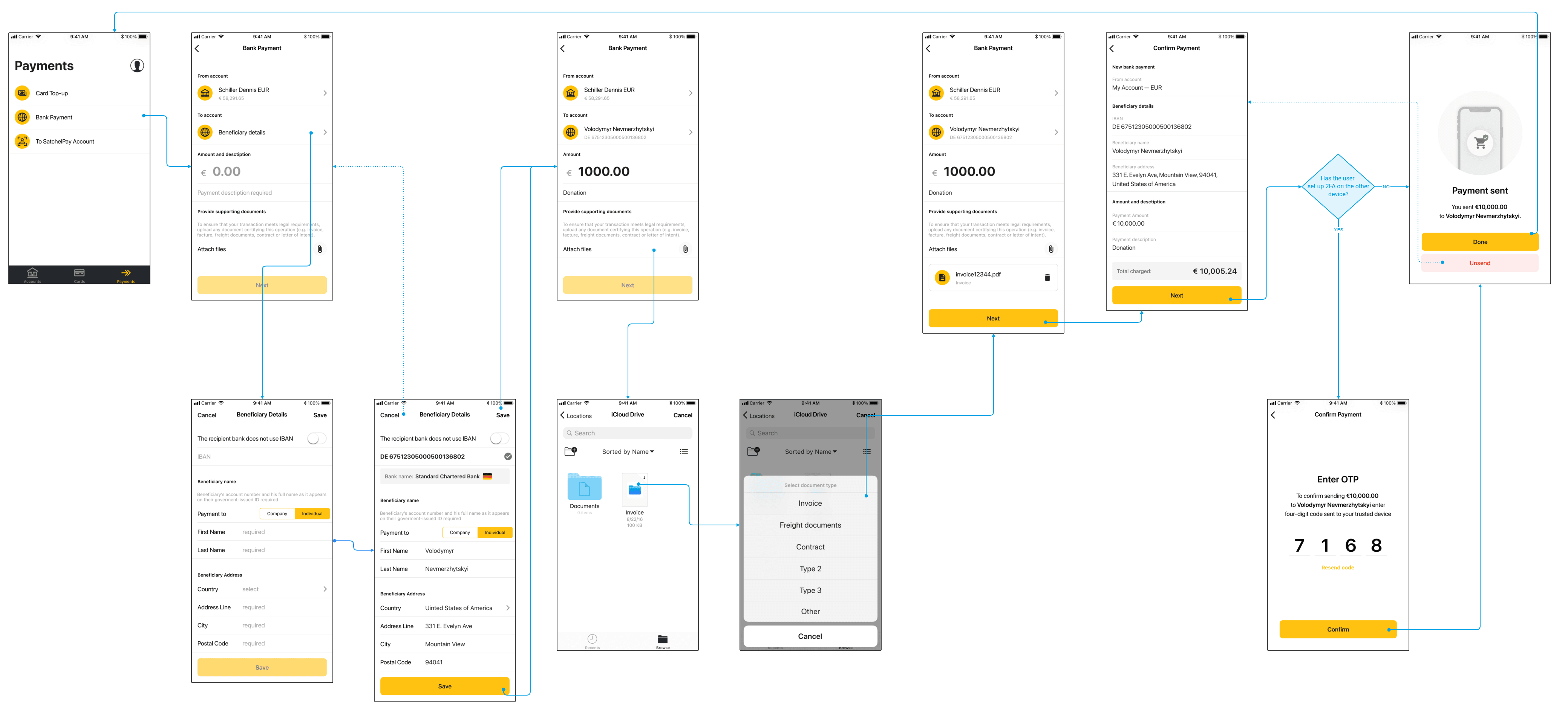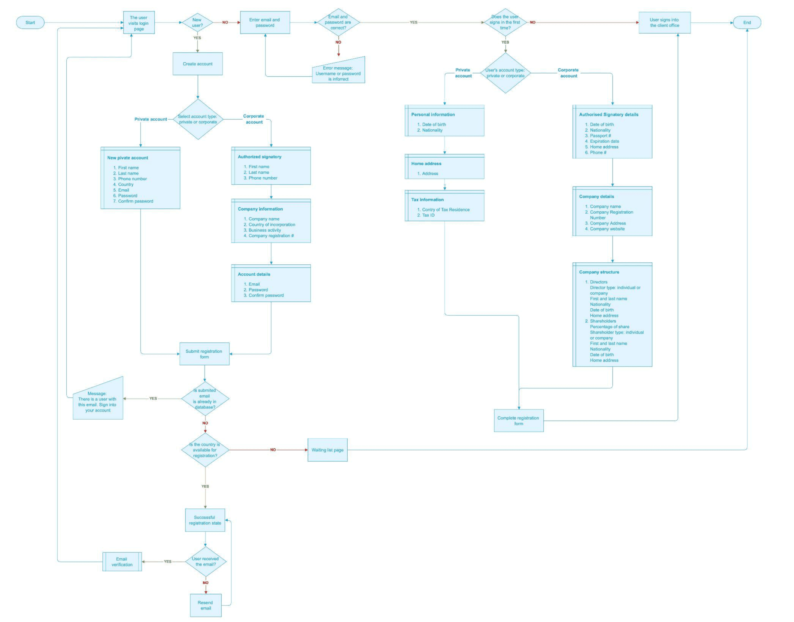The goal wasn’t to redesign banking architecture, but to translate business rules and engineering logic into clear, predictable interaction flows that teams could align around. The resulting process maps (the only surviving example being the Authentication & Registration flow presented below) became a shared reference that guided both product decisions and UI patterns.